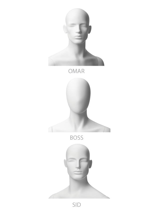 All mannequins can be ORDERED headless or can be combined with any heads. You have a choice of four designs: a realistic head with hair, a realistic head with sculptured hair, an abstract design or a head without hair or the illusion of hair.